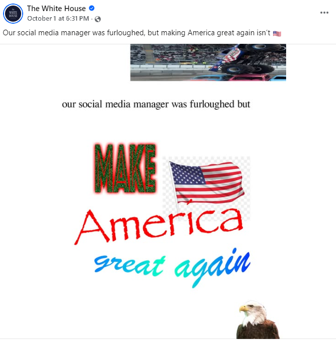 Facebook post by The White House on Wednesday, October 1st, 2025 at 6:31 PM with text: “Our social media manager was furloughed, but making America great again isn’t {US Flag Emoji}.